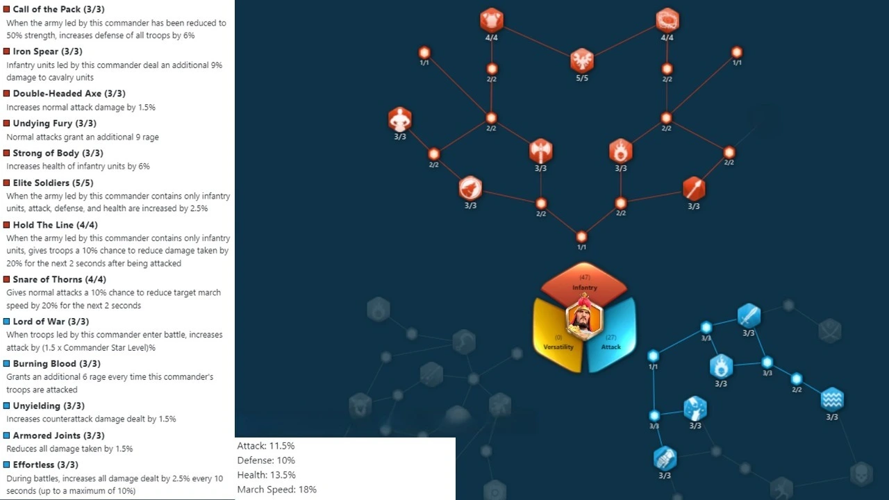 • Line Breaker: Infantry units gain 40% increased attack. Deal 5% increased damage to cavalry, but take 5% increased damage from archers.