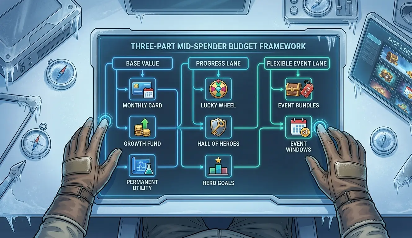 A smarter mid-spender strategy in Whiteout Survival is not about buying more packs. It is about giving each part of the budget a job. The strongest approach usually starts with a stable long-term base, finishes permanent utility early, treats hero progression as a dedicated lane, and only spends around events when the value really stacks.