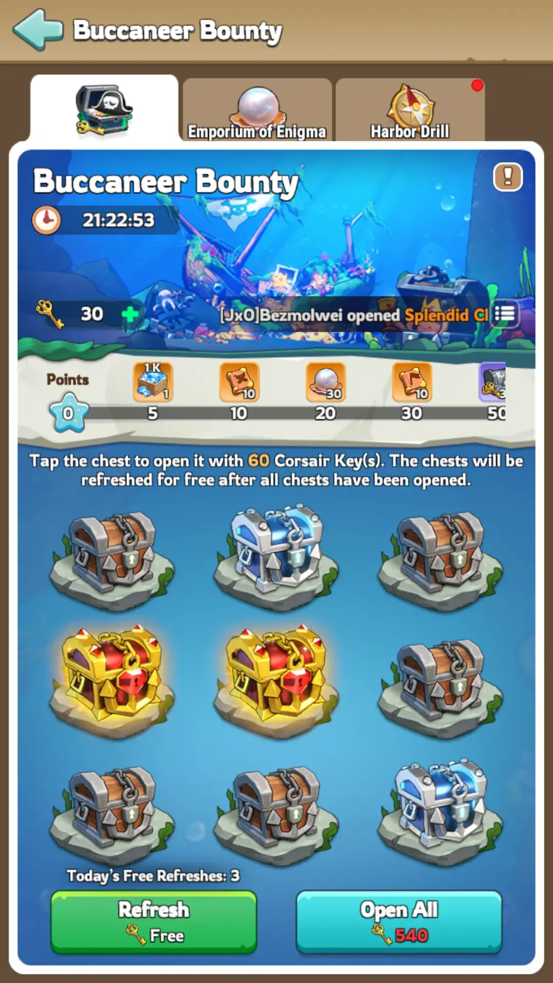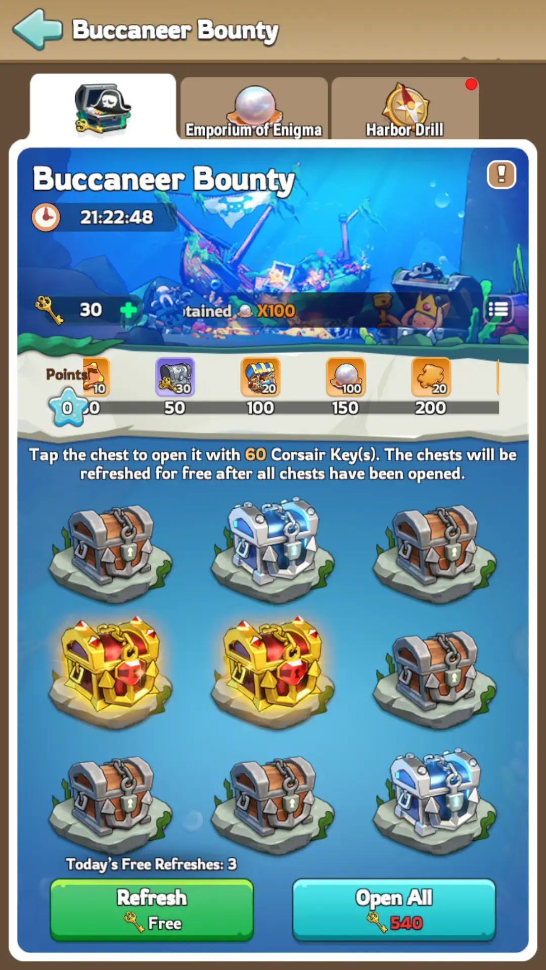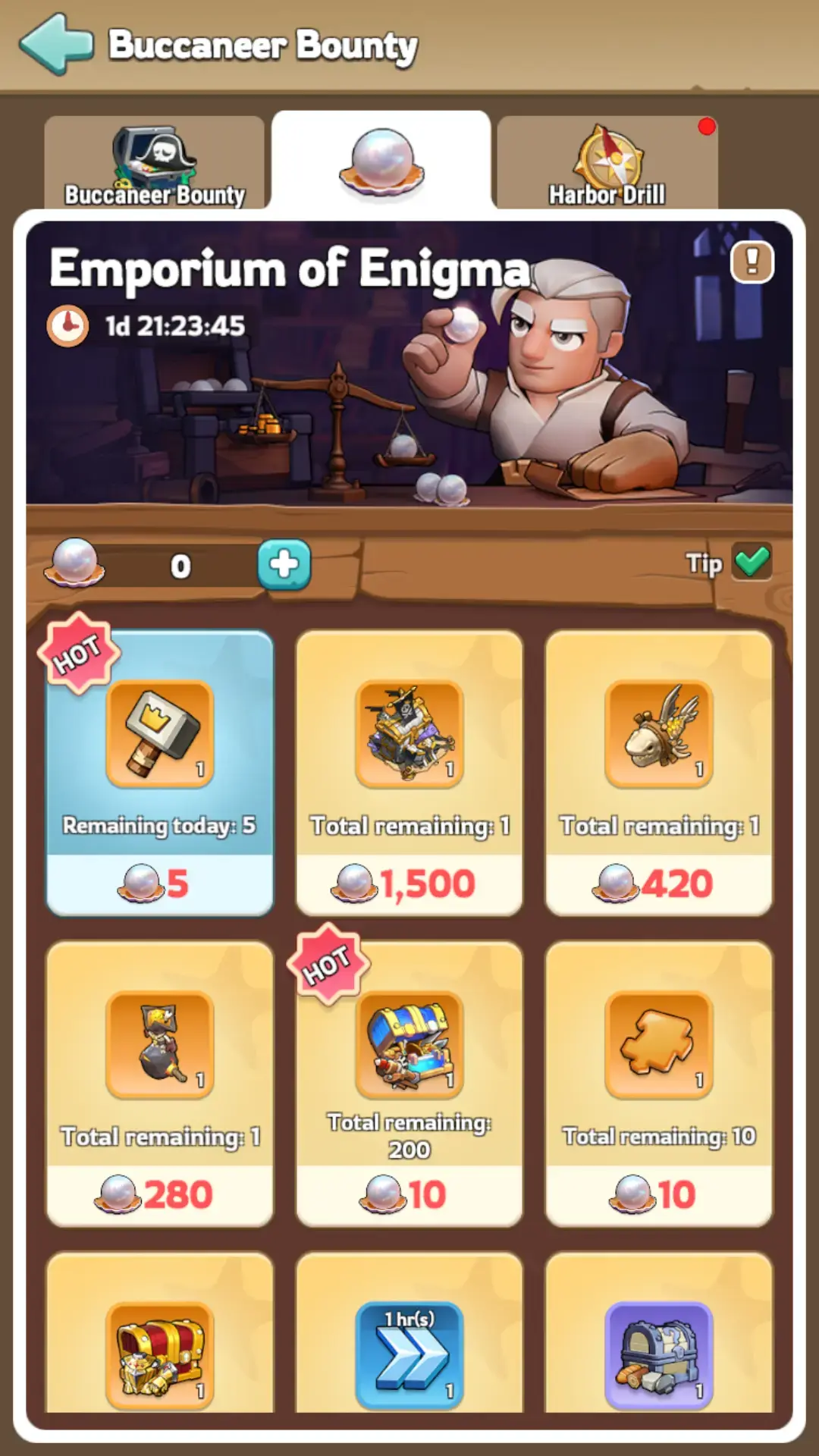 This event appears every 4-6 weeks and lasts for seven days. The main goal? Open chests with Corsair Keys to snag Pearls of Enigma. Then, trade those pearls for awesome goodies in the Emporium of Enigma. The event breaks down into three key areas: Harbor Drill, Buccaneer Bounty, and Emporium of Enigma.
