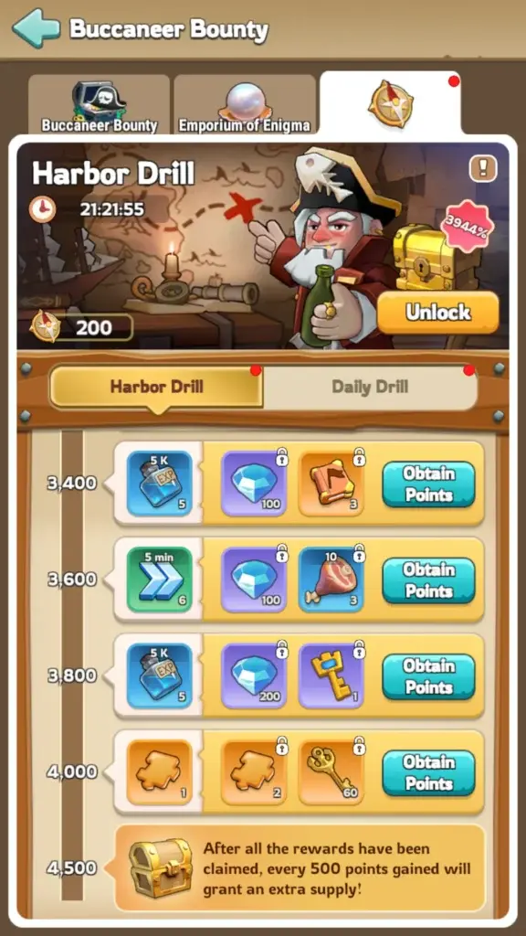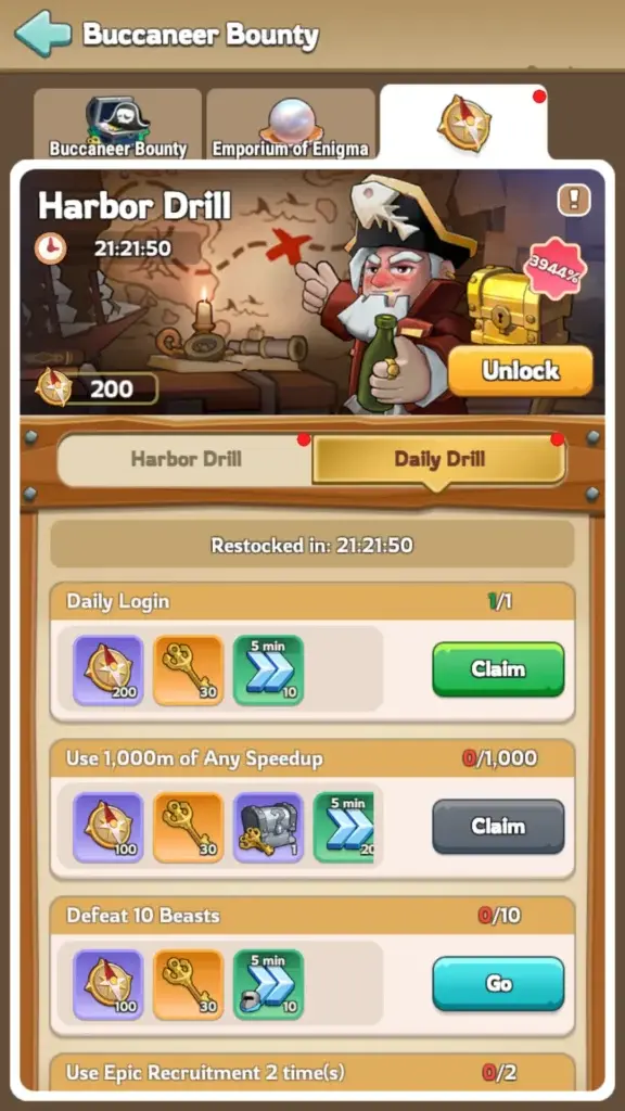 Daily Drill offers tasks for Corsair Keys and Treasure Hunt Points. Focus on completing tasks that give you the most Corsair Keys. Treasure Hunt Points unlock milestone rewards, which can also include Corsair Keys! Also, don’t forget about other goodies like speedups and gems.