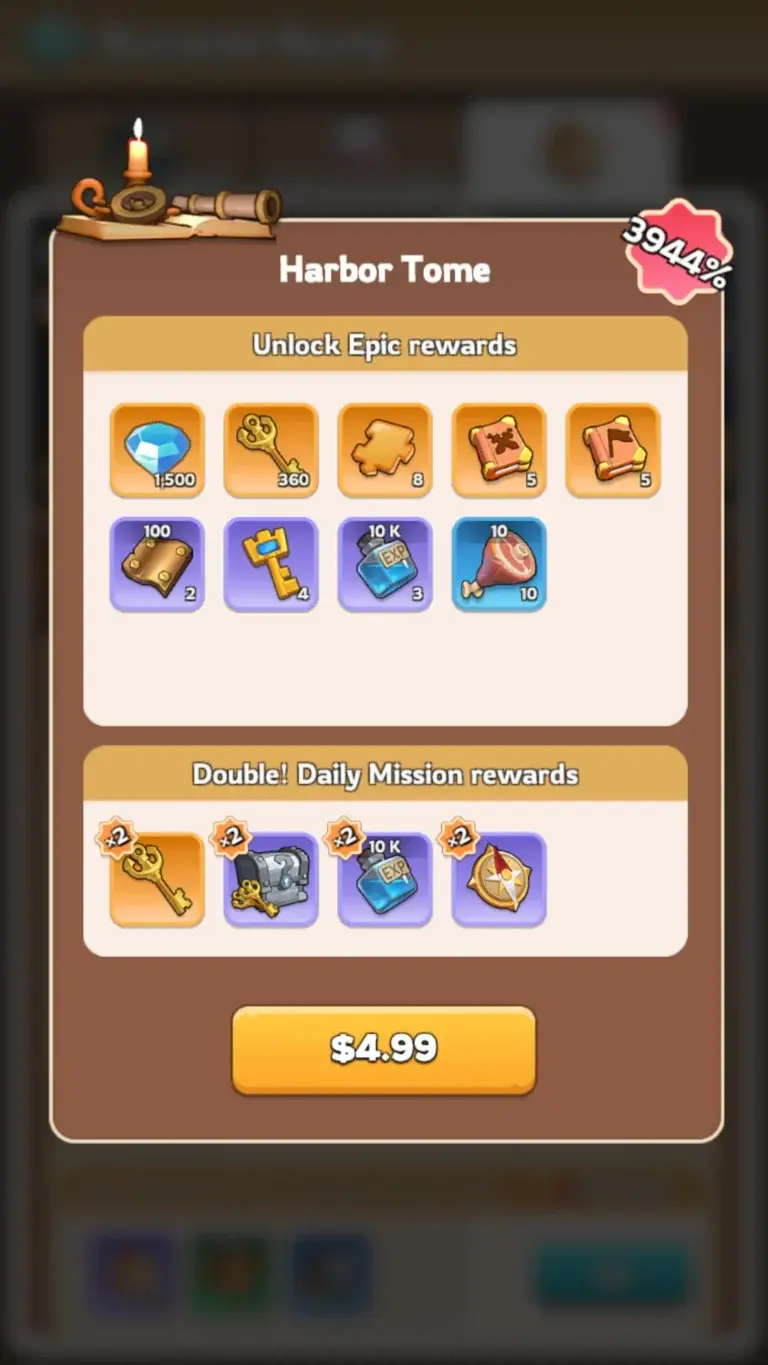 For a small investment ($4.99), the Harbor Tome is a game-changer. It doubles your Daily Drill rewards! Also, it unlocks Epic Rewards within the Harbor Drill milestones. These include extra Corsair Keys, gems, shards, and skill books. Therefore, this upgrade provides excellent value.