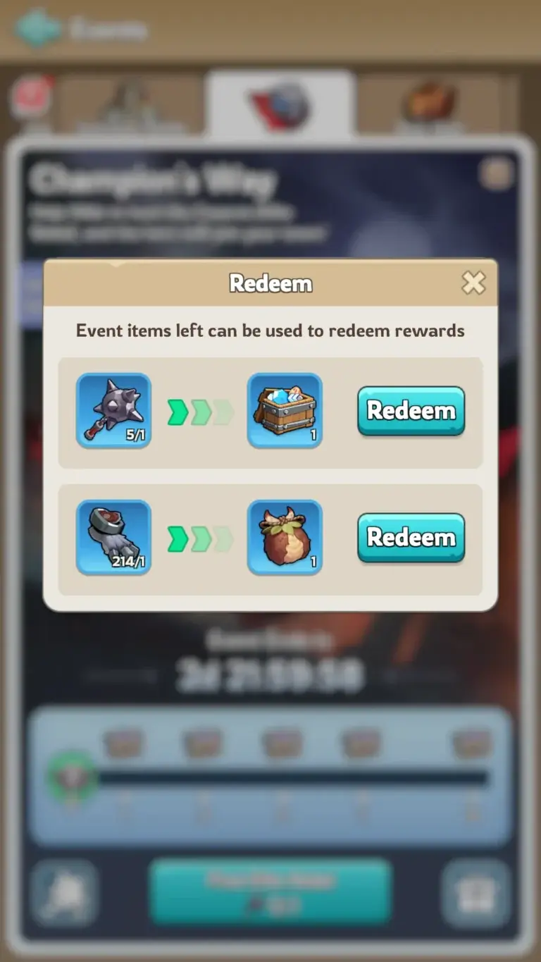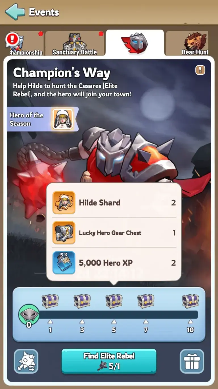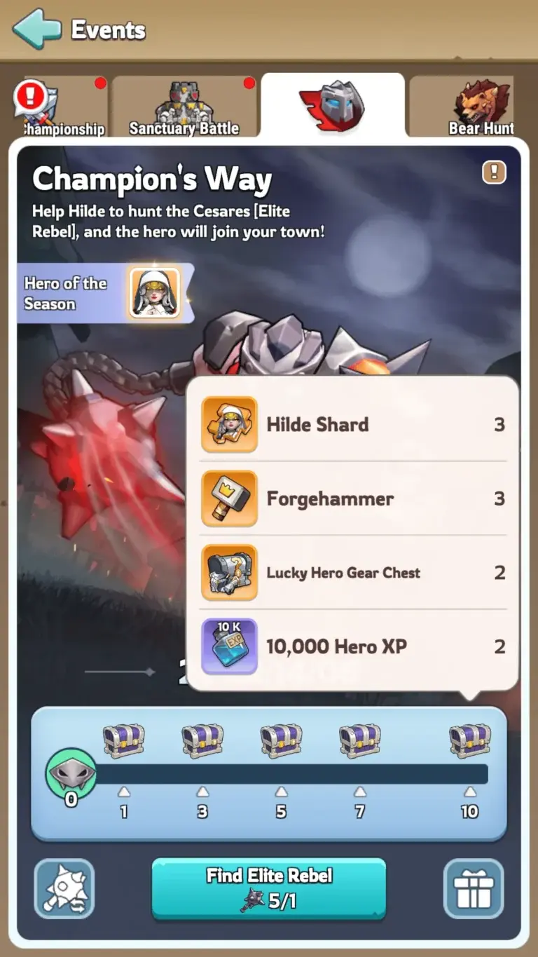 Beating Elite Rebels unlocks milestone chests. These contain Hero Shards, Hero XP, and other goodies. Beasts also drop Precious Keepsakes. You can open these for Gems, Stamina, and Speedups. Unlike the Desert Trial, you don’t need to max Hilde before exchanging Weapon Scraps.