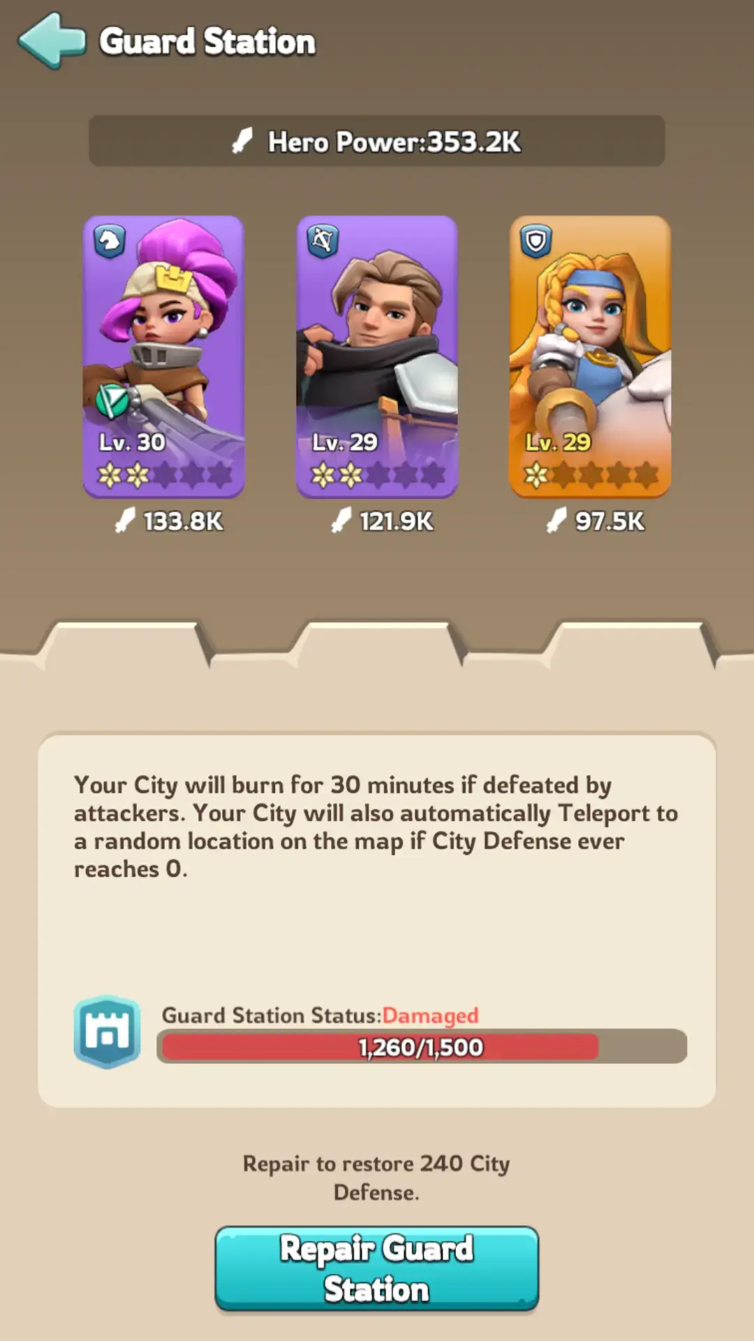 After an attack, restoring your Guard Station is essential. While you can restore some health every 30 minutes, instant full repairs with gems aren’t possible.