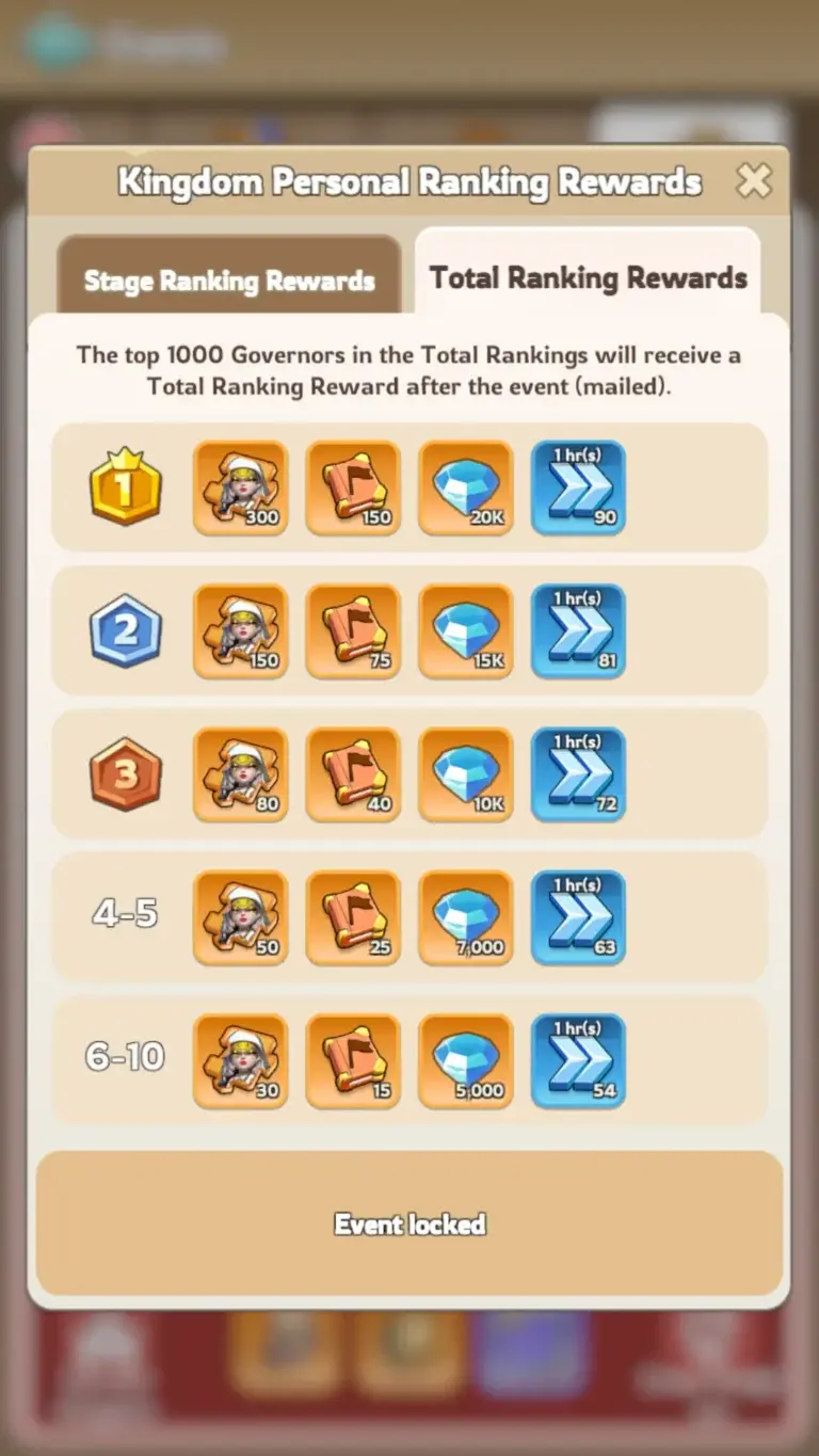 • Stage Ranking Rewards: Rank among the top 1,000 players in your kingdom daily. Receive gems and speedups based on your ranking.