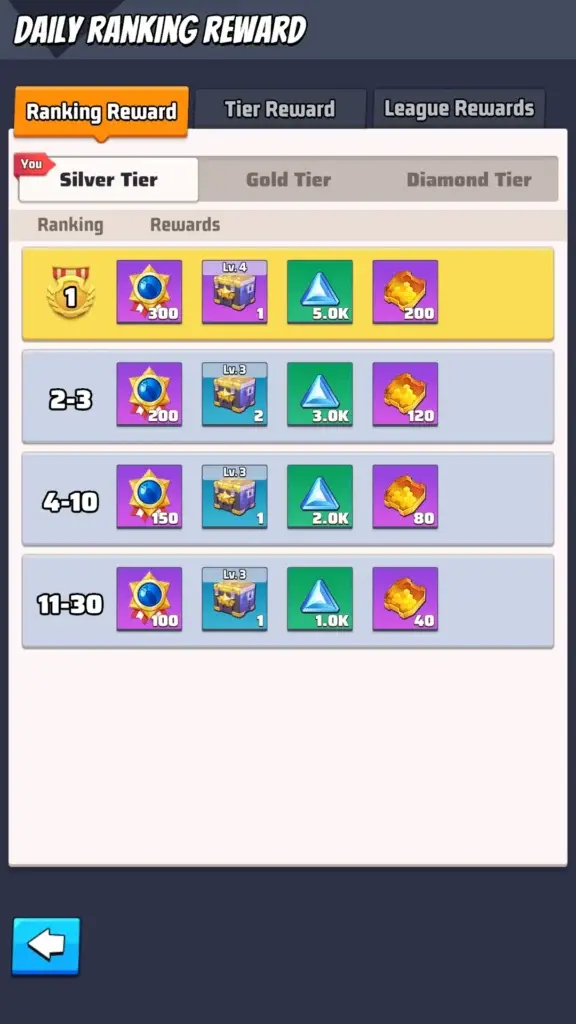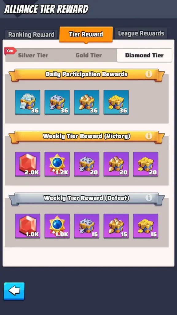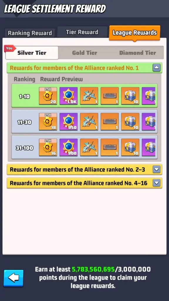 Ranking Rewards are divided into daily, weekly, and seasonal categories. The quality of rewards depends on your alliance’s tier (Silver, Gold, or Diamond). These rewards include Valor Badges, Diamonds, Drone Component Chests, and more. League Rewards also offer special skins!