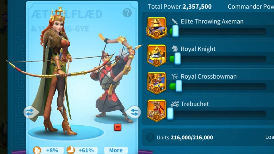 Pairing Aethelflaed with Sun Tzu provides a great amount of AOE damage and rage regeneration. For the greatest benefit, make sure you bring a balanced army with you.