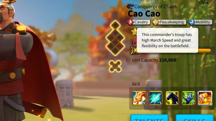 • Cao Cao: This legendary commander has peacekeeping and cavalry mobility talents. Moreover, his third skill, when maxed, grants a 10% march speed bonus.