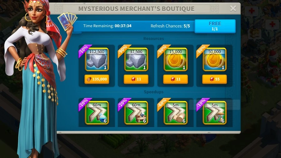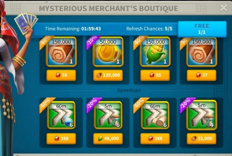 • Mysterious Merchant: She appears periodically with resource-for-speedup deals. Trading resources is preferable. This saves your precious gems! She returns to your city frequently, especially after building, training, or defeating barbarians.