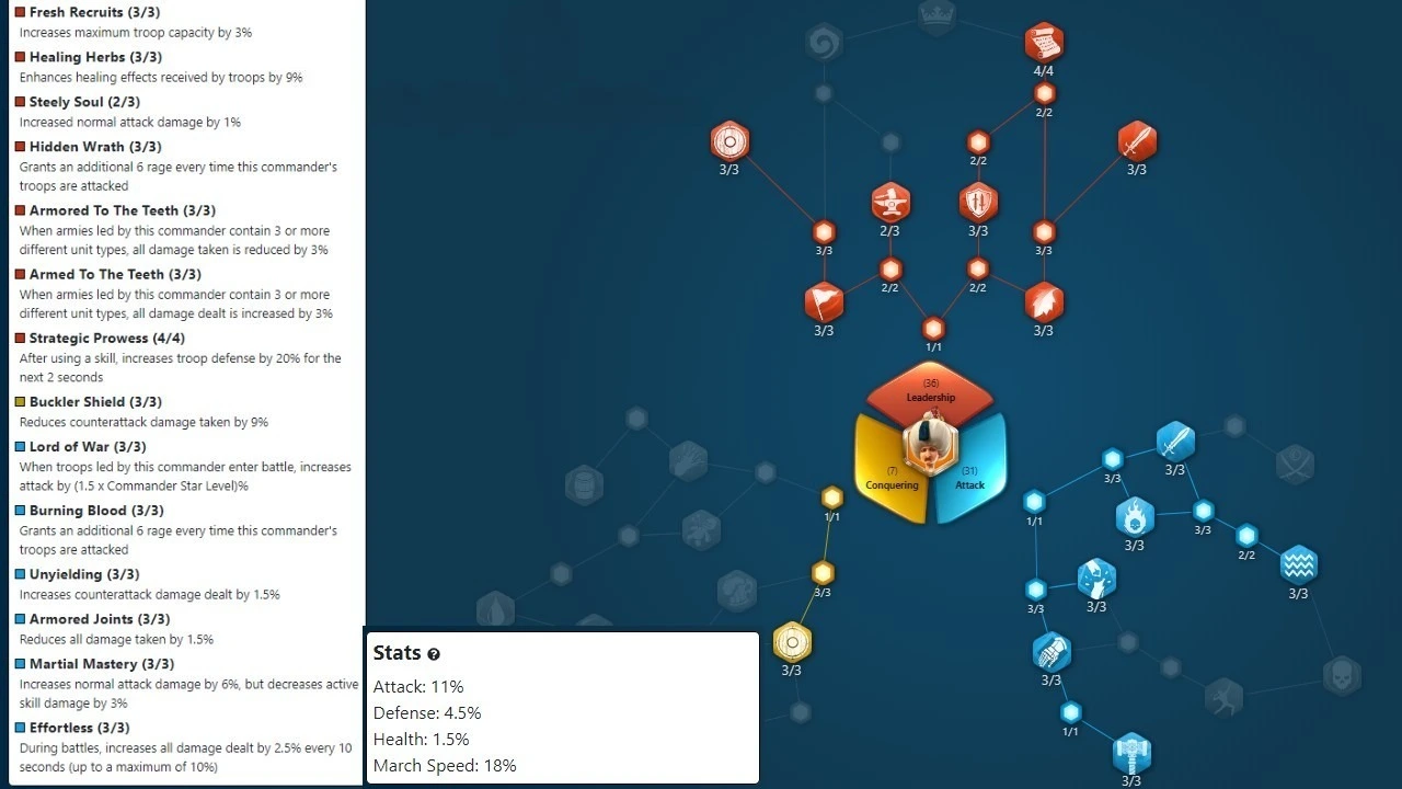 Upgrade Priority: Maximize this skill first for maximum damage output. - Annexation (Passive Skill): Increases troop attack and defense. It reduces damage taken outside alliance territory.