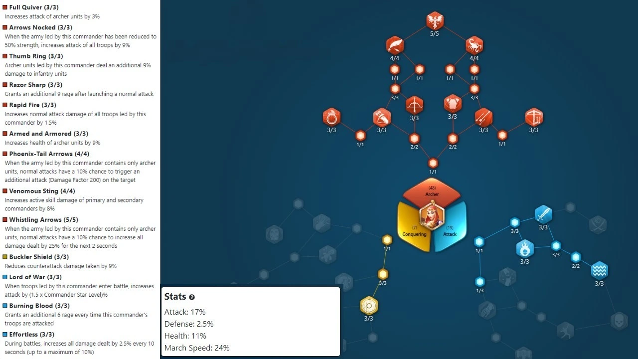 • Archer Tree: Invest heavily in talents that boost archer attack, defense, and health.