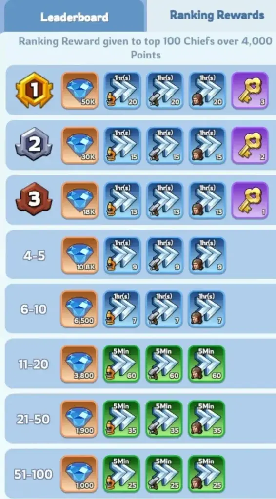 Ranking Rewards Speedups, Gems, Keys (Top 3 Players)