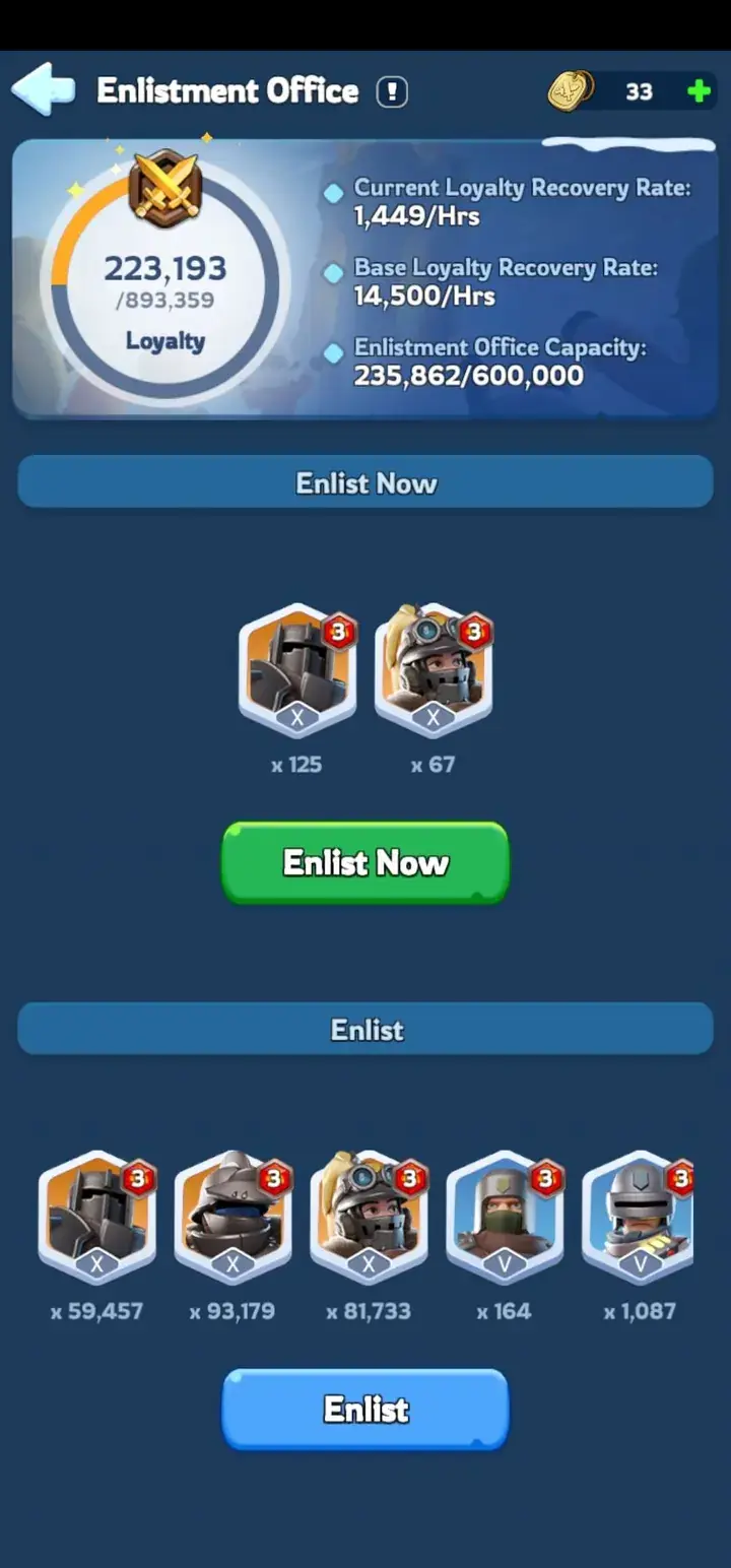 Once troops are in the Enlistment Office reserves, you need Loyalty Points to recruit them. The Enlistment Office generates these points automatically. However, the rate depends on a few factors.