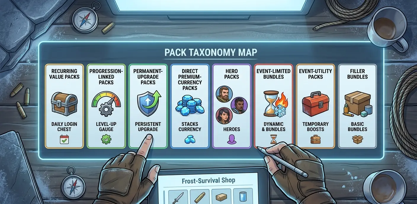 Whiteout Survival packs are not one simple shop category. They are a mix of recurring value packs, progression-linked offers, permanent-upgrade packs, premium-currency tiers, hero packs, event-limited bundles, and mechanic-specific utility purchases. Once you see the ecosystem that way, the shop becomes much easier to understand.