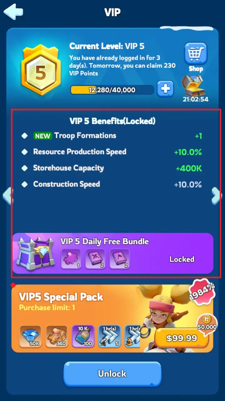 Reaching VIP level 12 takes dedication, especially for free-to-play players. Relying solely on daily logins could take years. ❄️